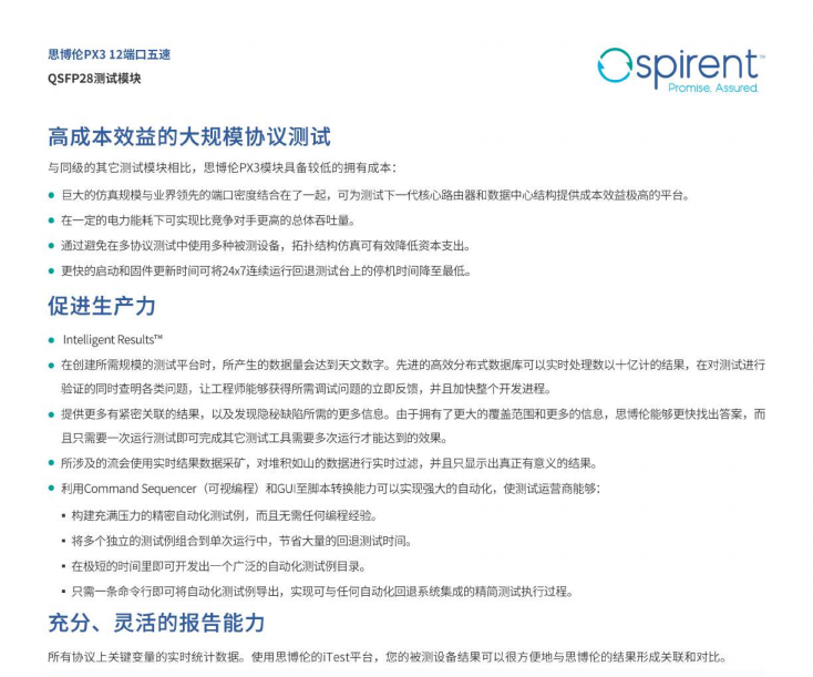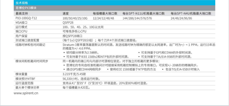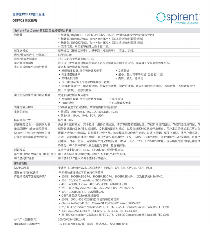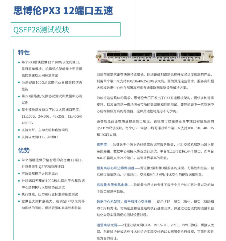 产品简述:为响应这些具体的需求,思博伦专门开发出了PX3五速模块架构,提供多种速率支持,以及面向这一市场增长市场的高密度和性能测试。要想验证下一代数据中心结构和服务商的路由器,这种灵活性将是必不可少的。设备制造商正在快速提高端口密度。该模块可以提供业界中端口密度最高的QSFP28尺寸模块。每个QSFP28接口均可通过单个端口来支持100、50、40、25和10G以太网。