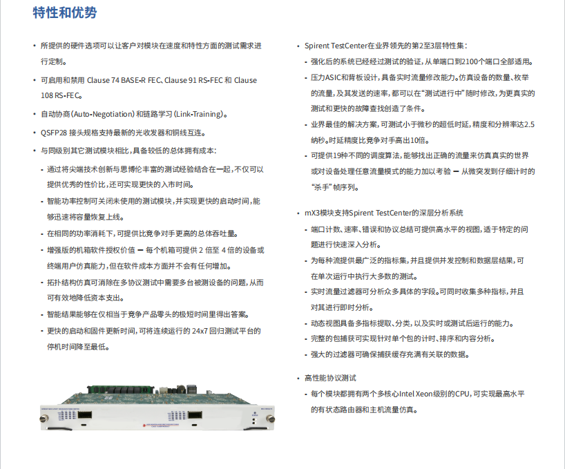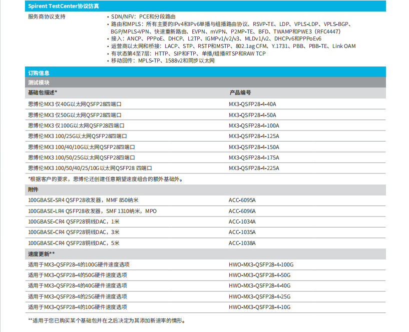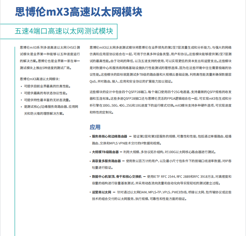 产品简述:思博伦mX3以太网多速测试模块将思博伦在业界领先的第2至7层流量生成和分析能力,与强大的网络仿真和应用层协议结合在一起,可用于仿真多种设备类型、用户和协议。这些模块能够提供第2至7层测试的最高性能。由于功耗的降低,以及五速支持的使用,可以实现更低的资本支出和运营支出。这些模块是对数据中心和服务商网络基础设施执行性能测试的理想选择,因为在这些环境中往往需要极端的协议性能。这些模块的目标就是测试多TB级的路由器和大规模云基础设施,利用高性能流量来确保数据层QoS,并对路由、接入、应用和安全协议的扩展能力加以验证。