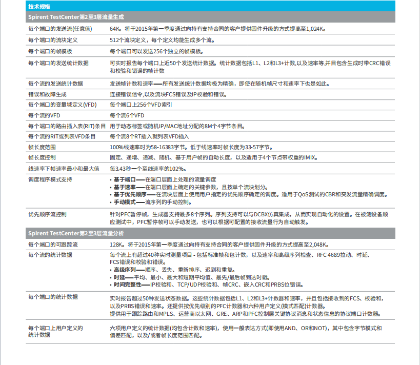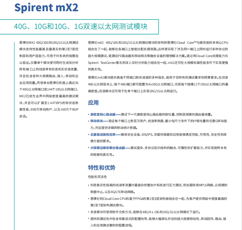 产品简述:思博伦mX2 40G/10G和10G/1G以太网测试模块的架构将思博伦Cloud CoreTM与高性能的多核心CPU结合在了一起,能够在各端口上智能分配处理资源。这样便实现了涉及同一端口上同时运行多种协议的超大规模测试,是测试PE路由器和移动网关等融合设备的理想解决方案。通过将Cloud Core处理能力与Spirent TestCenter著名的深入实时分析能力结合在一起,mX2还可在大规模和高性能条件下实现更强的真实性。