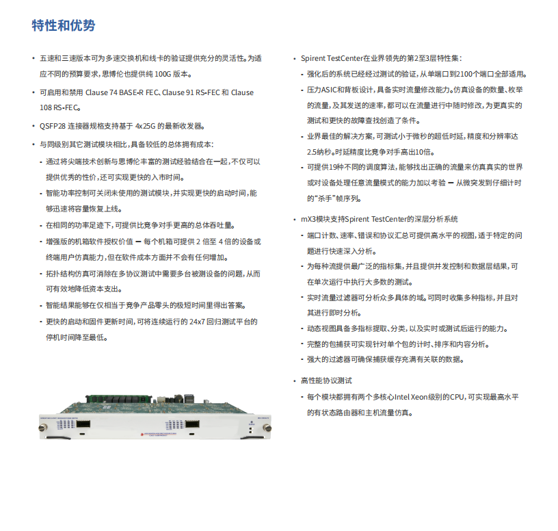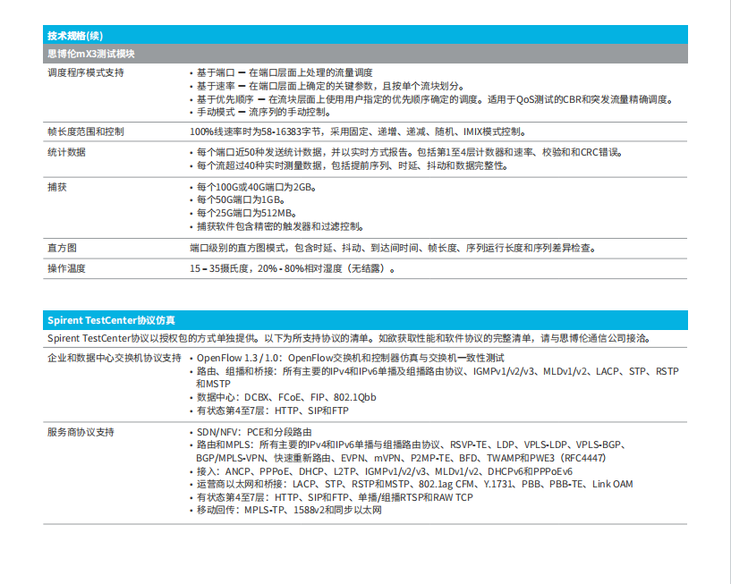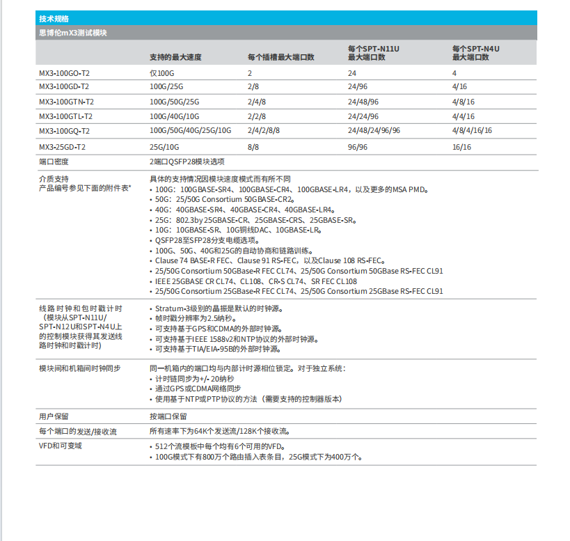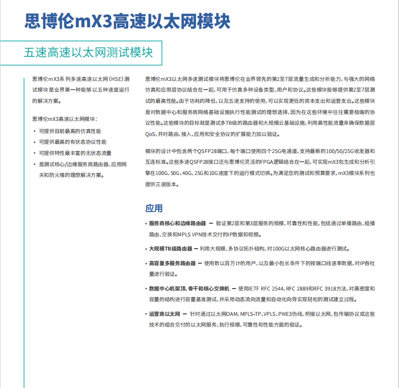 产品简述:思博伦mX3以太网多速测试模块将思博伦在业界领先的第2至7层流量生成和分析能力,与强大的网络仿真和应用层协议结合在一起,可用于仿真多种设备类型、用户和协议。这些模块能够提供第2至7层测试的最高性能。由于功耗的降低,以及五速支持的使用,可以实现更低的资本支出和运营支出。这些模块是对数据中心和服务商网络基础设施执行性能测试的理想选择,因为在这些环境中往往需要极端的协议性能。这些模块的目标就是测试多TB级的路由器和大规模云基础设施,利用高性能流量来确保数据层QoS,并对路由、接入、应用和安全协议的扩展能力加以验证。