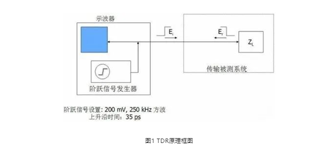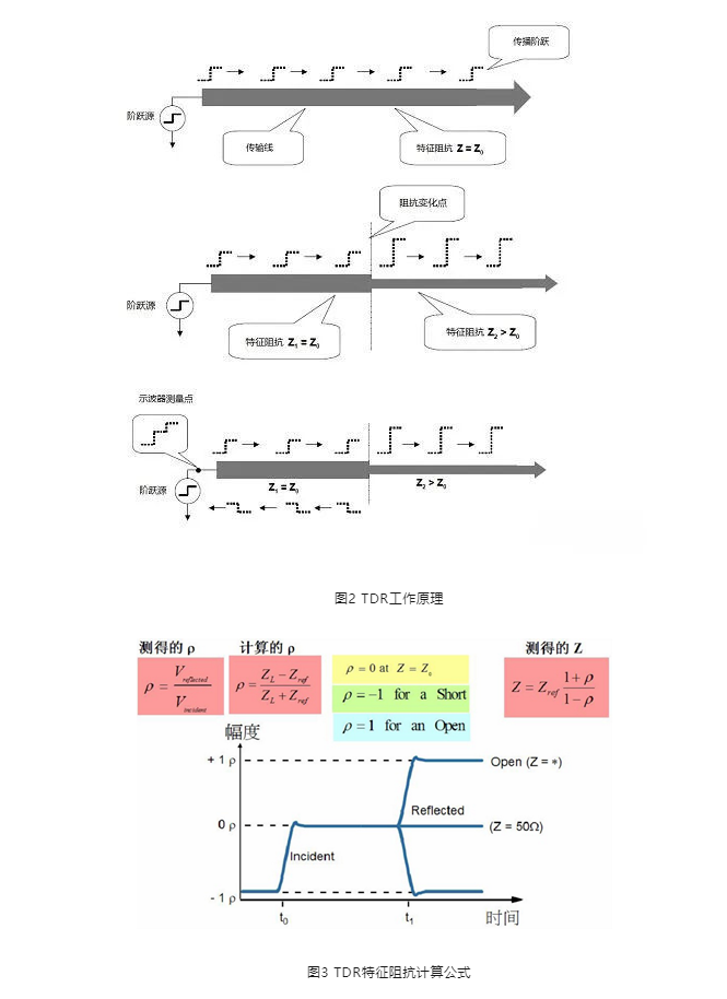 工作原理:内部阶跃信号源会发出阶跃信号,通过探头组件传输到待测传输线上,当传输线中发生阻抗变化时,一部分阶跃信号会反射,其余信号会沿着传输路径继续向前传输(图2)。同时内部的采样示波器会检测反射信号的电压幅度,通过计算得出不同的阻抗值(图3)。另外,由于示波器采集到的信号是反射信号与入射信号的叠加信号(两者存在时间差,因此叠加信号是带台阶的阶跃信号),通过测量这个台阶,可测算出反射信号的时间,进而计算出传输路径中阻抗的变化点的位置。