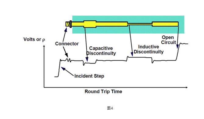 TDR最终可呈现出一条随着时间推进,阻抗变化的波形,配合正确的介电常数,可精确计算出每一个阻抗变化点的长度位置信息(图4)。