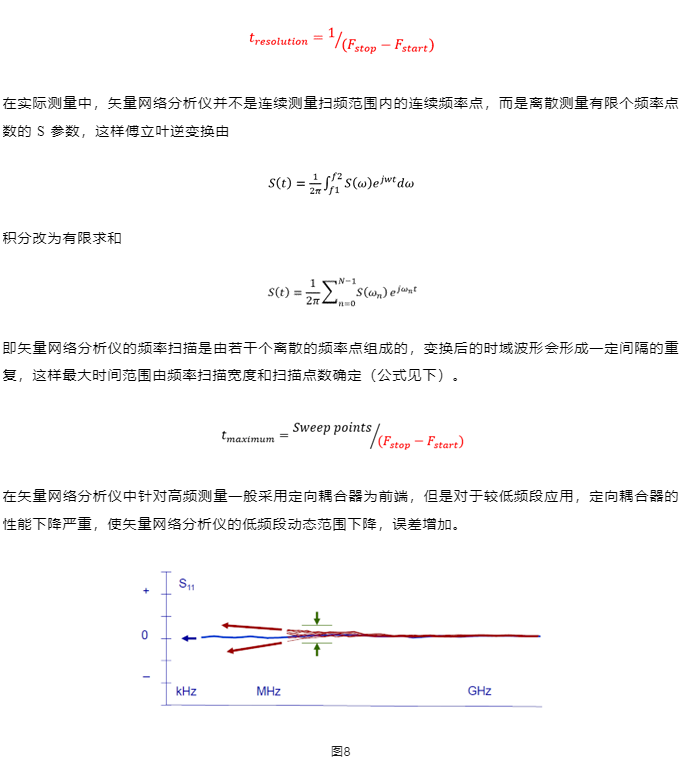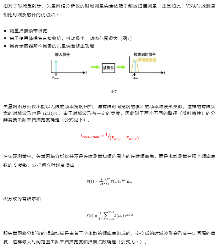 任何时域上的信号都是由若干个正弦波组成。如果知道这些正弦波的幅度和相位关系,计算得到信号的时域波形。矢量网络分析仪的频率扫描测量就是在不同的时间(扫描期间)测量不同频率点的输入与输出信号正弦波信号的幅度和相位关系(S参数),通过傅立叶反变换得到被测件的时域响应。这些不同频率点的信号并不是同时存在的,矢量网络分析仪并没有直接产生时域脉冲或阶跃信号。